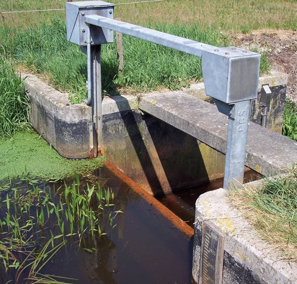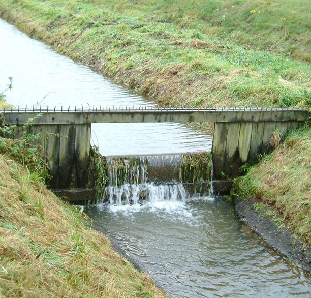 1) Schotbalkstuw – Stuw constructie met een sponning waarin schotbalken worden opgestapeld om een gewenste drempelhoogte te bereiken.