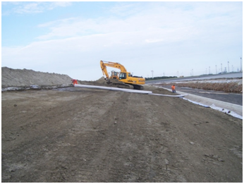 Voorbeeld: geotextiel dat op het basismateriaal van een bekledingsconstructie wordt aangebracht.