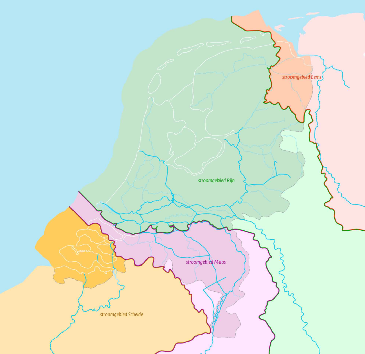 De allergrootste afvoergebieden (drainage basins) waar je als Nederlandse waterbeheerder mee te maken hebt, zijn de stroomgebieden (river basins) van de Maas, Schelde, Eems en Rijn. Deze gebieden zijn landgrensoverschrijdend. (zie afbeelding 2.1)