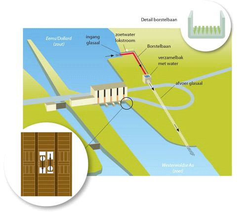 3) Aalpijp – Een vispassage in de vorm van een pijp of goot, waarmee de glasaal van een zout- naar een zoetwaterleefgebied kan trekken