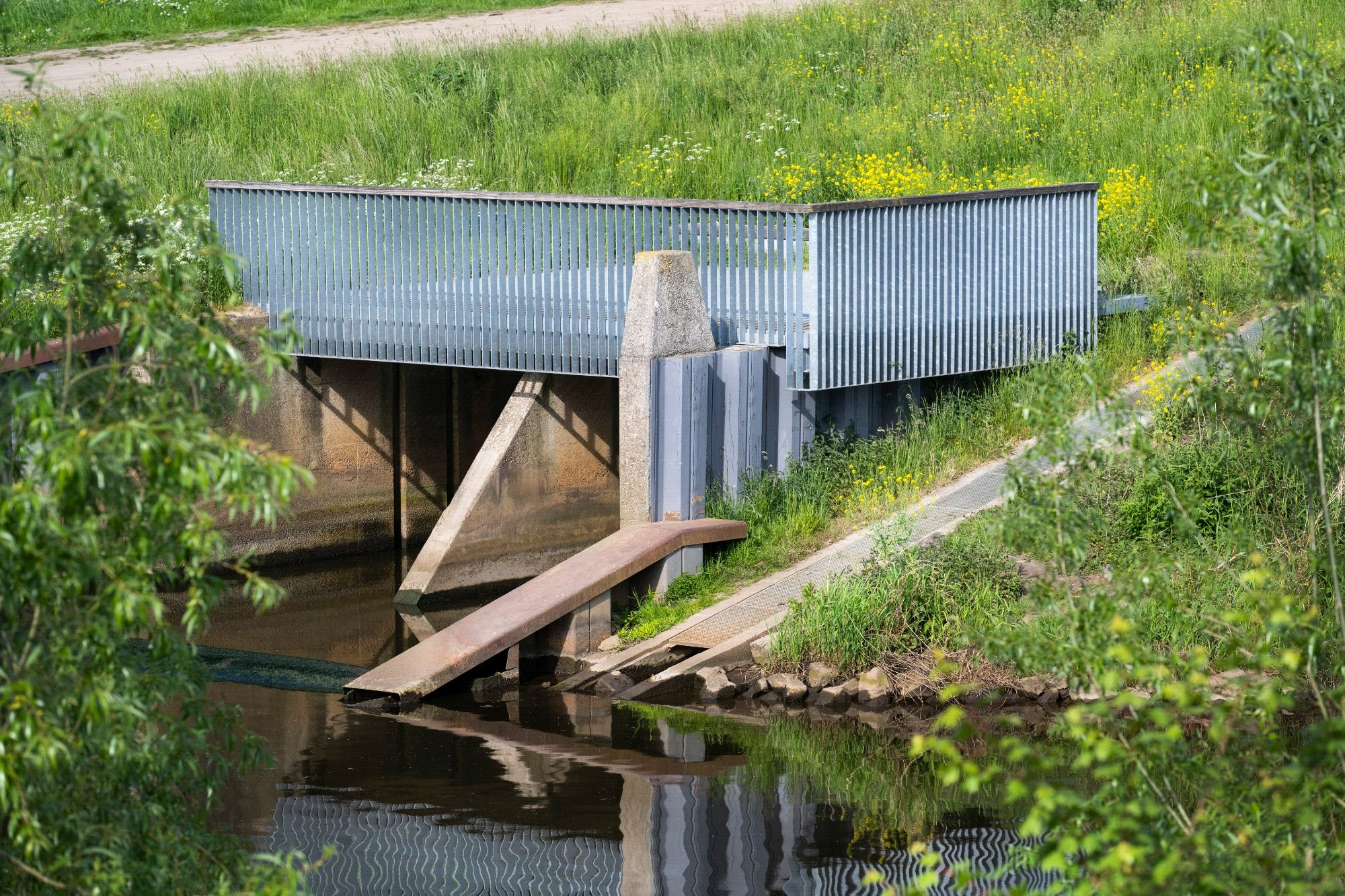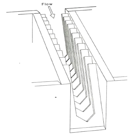5) Deniltrap – Een vispassage in de vorm van een hellend kanaal uitgerust met tussenschotten, waarmee een vis zich van een hoog naar een laag waterniveau kan verplaatsen. De schotten in deze vispassage remmen de sterke stroming af en werpen ook een turbulente tegenstroom op. Deze vispassages zijn daarom alleen geschikt voor sterke vissoorten.