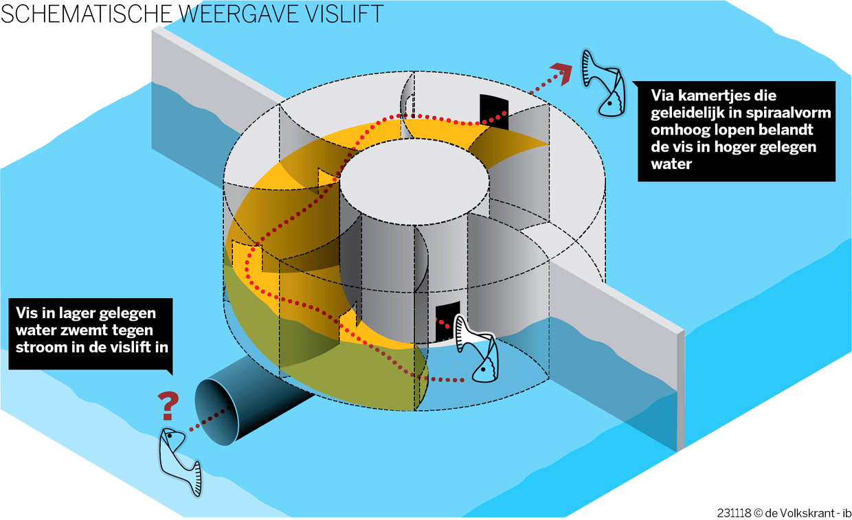 1) Vislift – Een vispassage in de vorm van een spiraal met opeenvolgende kamers, waarbinnen een vis zich met behulp van een waterstroom kan verplaatsen. Dit type vispassage kan (indien hiervoor ingericht) uitgerust zijn met sensoren en camera's waarmee gegevens verzameld worden over waterkwaliteit, waterkwantiteit, biodiversiteit en ecologische toestand. Ook is het mogelijk om via een dashboard, ook op afstand, de eigenschappen van de vispassage aan te passen, zodat bijvoorbeeld de vispassage wordt afgestemd op een migrerende vissoort of op het seizoen. In de vispassage is een pomp aanwezig die een lokstroom creëert om de vissen de vispassage in te lokken. Ook is er een rustkamer aanwezig, waarin de vissen kunnen wennen aan de omgeving.
