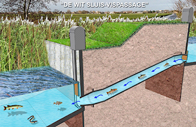 4) Vissluis – Een vispassage die aan weerszijden afsluitbaar is met een schuif, waarbij één schuif deels geopend is om een waterstroom te creëren en de andere schuif volledig is geopend, zodat een vis zich er door heen kan verplaatsen