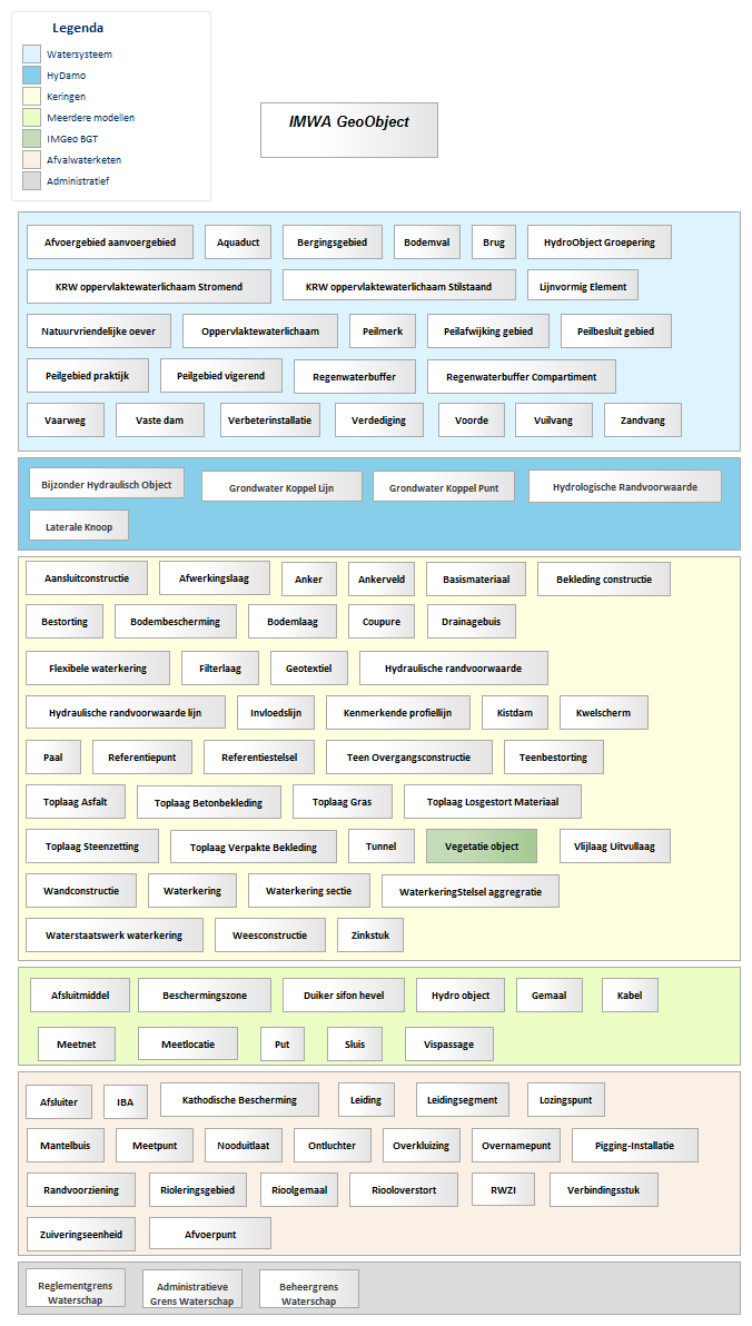 Het IMWA GeoObject bevat alle verplichte attributen vanuit IMWA/Inspire die voor alle geometrische objecten geldig zijn. Een overzicht van de objecten die hieronder vallen staan in de afbeelding in de paragraaf Functioneel Model.