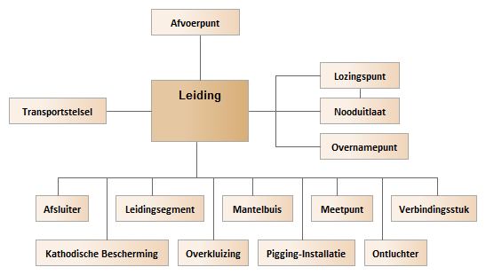 Afsluiter, Afvoerpunt, KathodischeBescherming, Leidingsegment, Lozingspunt, Mantelbuis, Meetpunt, Nooduitlaat, Ontluchter, Overkluizing, Overnamepunt, PiggingInstallatie, Transportstelsel, Verbindingsstuk |