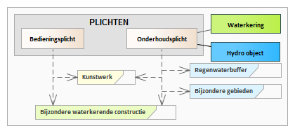 De onderhoudsplicht van bij de waterbeheerder in beheer zijnde objecten, zoals in de legger of in voorschriften bij ontheffingen is aangegeven.